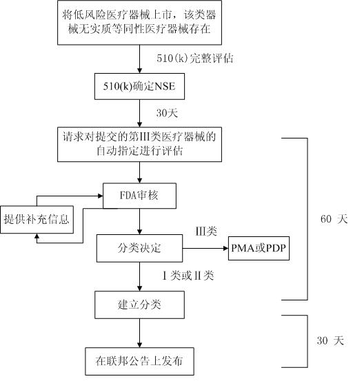 第Ⅲ類醫(yī)療器械的自動指定,也被稱為“de novo”或“基于風(fēng)險(xiǎn)”分類,是指某類新的低風(fēng)險(xiǎn)類醫(yī)療器械因?yàn)闆]有與已經(jīng)上市的醫(yī)療器械具有實(shí)質(zhì)等同性而被劃歸為第Ⅲ類醫(yī)療器械,依據(jù)de novo機(jī)制將其重新劃歸為Ⅰ類或Ⅱ類器械的機(jī)制。在該機(jī)制下,當(dāng)?shù)惋L(fēng)險(xiǎn)新醫(yī)療器械申報(bào)者收到非實(shí)質(zhì)等同性(NSE)決議的30天內(nèi),可以向FDA請求對申報(bào)的器械進(jìn)行de novo分類。申報(bào)者須提供器械及詳細(xì)信息的描述,并說明要求重新分類的理由。FDA會按照《聯(lián)邦食品、藥品和化妝品法》(FD&C Act)的513(a)(1)制定的要求和標(biāo)準(zhǔn)對器械進(jìn)行重新分類。在申報(bào)者提交請求的60天內(nèi),F(xiàn)DA將會做出重新分類的決定,將申報(bào)的器械劃歸三種器械類型中的一種。第Ⅲ類醫(yī)療器械的自動指定評估的流程如圖1所示:
